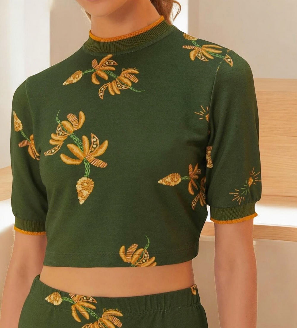 Blusa cropped estampada Brilho de banana, confeccionada em tecido leve com elastano e modelagem justa. Possui mangas curtas e gola arredondada com detalhe em retilínea, que traz um charme esportivo. Perfeita para um visual casual e versátil, combina facilmente com jeans ou saias. FARM Rio Original – Coleção Alto Inverno 25.