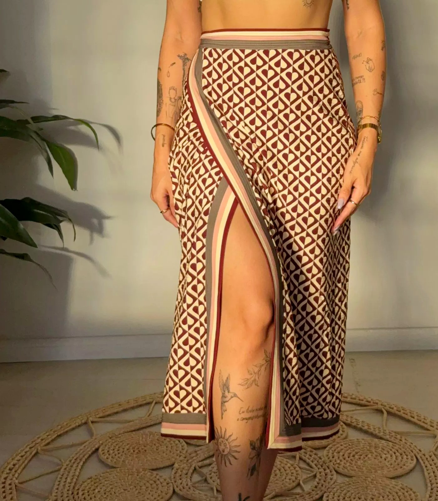 Saia midi estilo envelope com estampa Amori, confeccionada em tecido leve e fluido que proporciona movimento ao caminhar. Possui cintura alta com elástico discreto e barras com acabamento em viés. Uma peça versátil, perfeita para passeios ao ar livre, almoços descomplicados ou para compor looks casuais com charme e leveza.