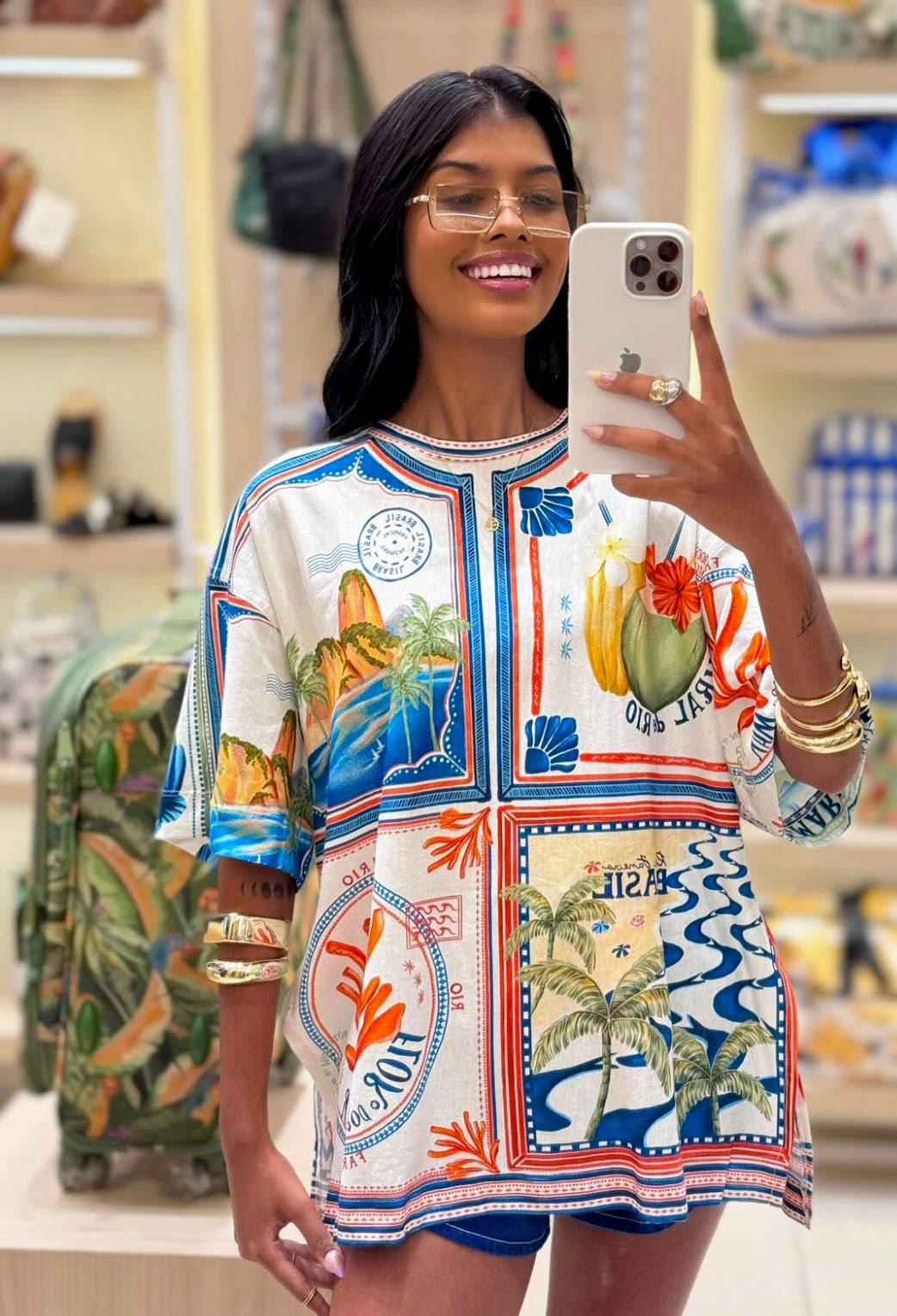Com visual descontraído e cheia de personalidade, esta t-shirt é perfeita para compor looks leves, coloridos e autênticos. Possui modelagem mais soltinha, com aberturas laterais que proporcionam conforto e um caimento moderno. A estampa exclusiva traduz a brasilidade e o espírito livre do verão, trazendo alegria e frescor para o seu look.