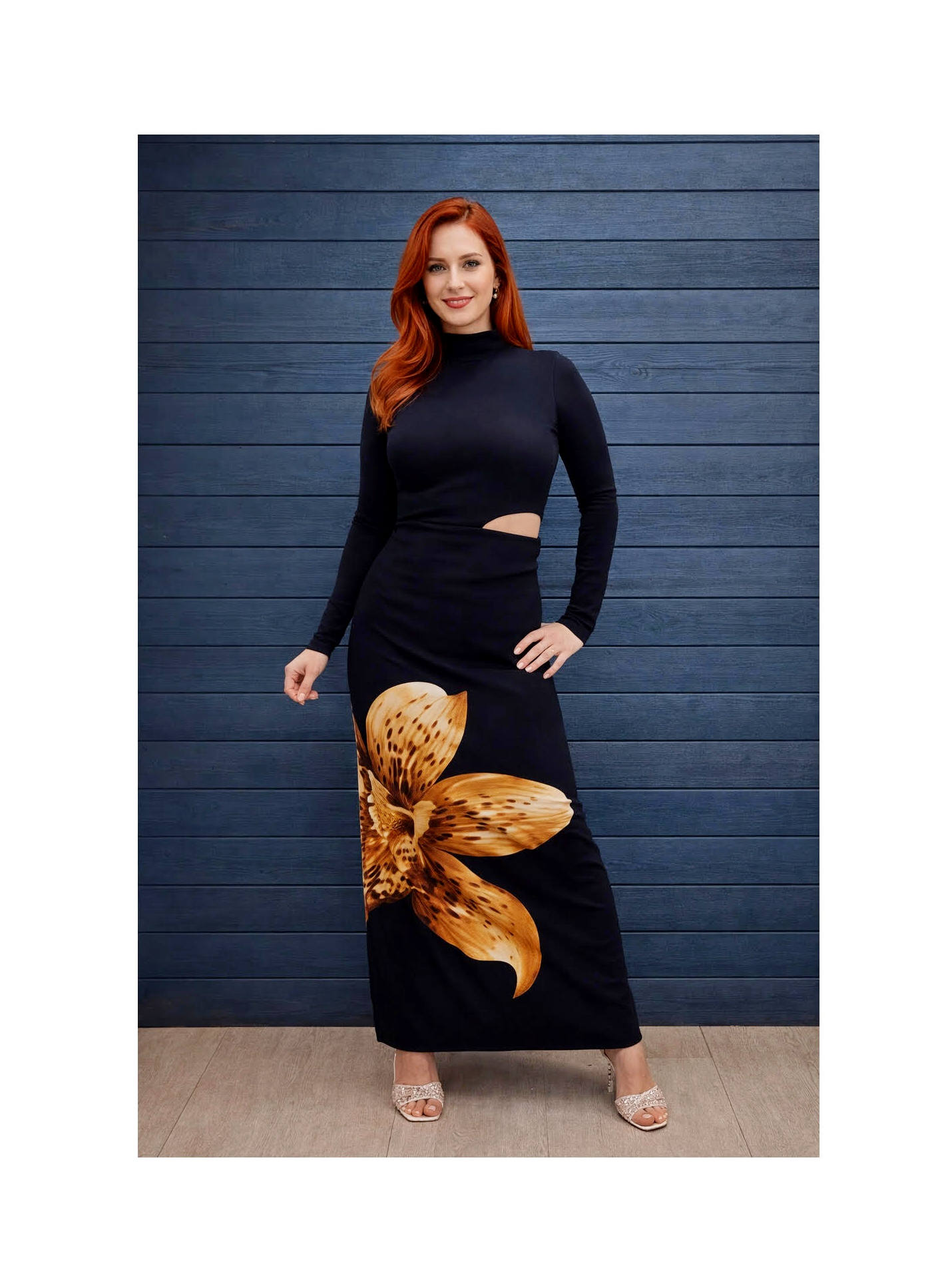 Vestido longo em viscose com elastano, de manga longa e caimento que valoriza o corpo com conforto. O decote lateral e os franzidos nas laterais e nos punhos trazem um toque moderno e feminino à peça. O desenho localizado de orquídea onça na lateral completa o visual com originalidade e autenticidade, criando uma proposta marcante e cheia de personalidade para diferentes ocasiões.
