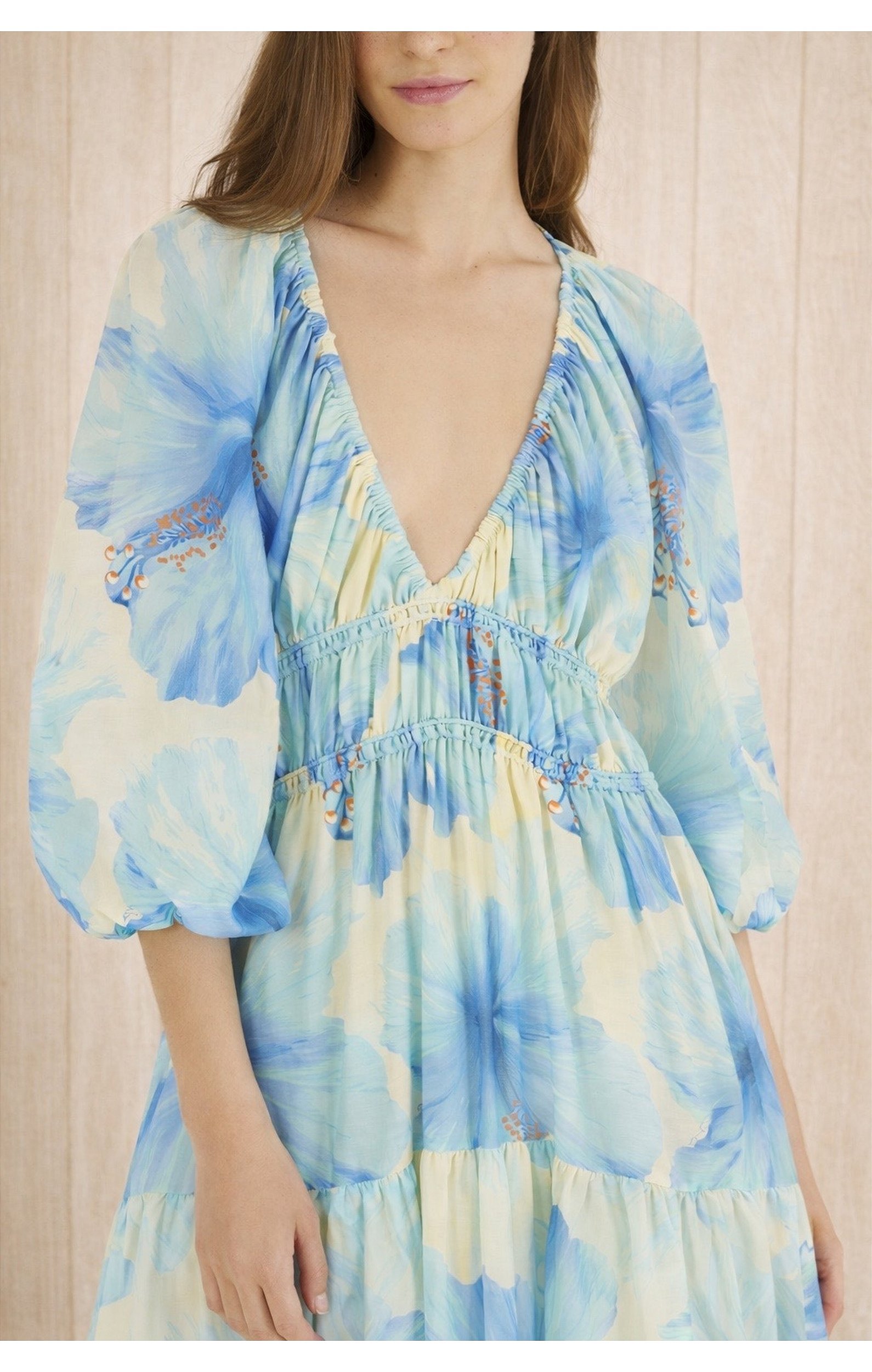 A modelagem conta com decote em V elegante, que alonga a silhueta, além de cintura com elástico que garante ajuste confortável ao corpo. As mangas também possuem acabamento com elástico, trazendo um toque romântico e estruturado ao visual.