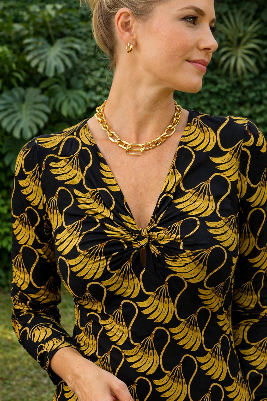 Com modelagem ajustada, a peça apresenta decote com recorte vazado e efeito torcido, detalhe que cria um visual sofisticado e contemporâneo. As mangas longas equilibram o design, enquanto o mix de estampas em cores contrastantes traz identidade e destaque ao look.