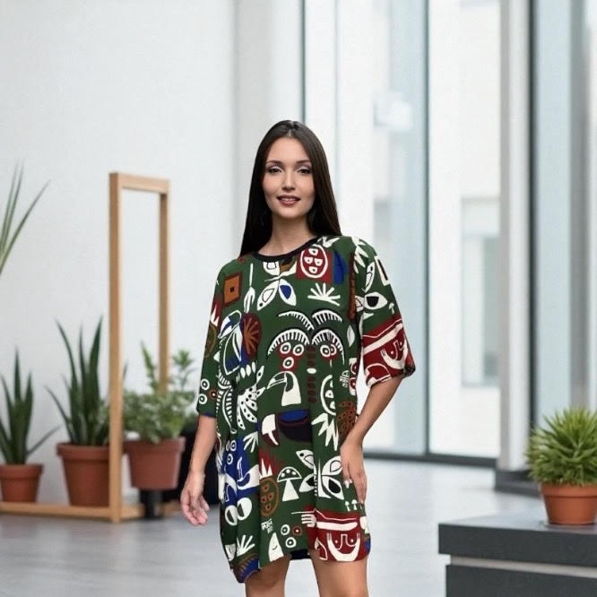 Confeccionado em viscose leve e fluido que proporciona movimento ao caminhar. Uma peça versátil, perfeita para passeios ao ar livre, almoços descomplicados ou para compor looks casuais com charme e leveza. Tem gola em retilinea e design estilo camiseta larga.